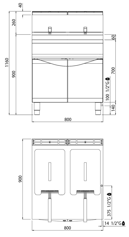 - Зовнішні розміри (ШxГxВ): 800 x 900 x 1160 mm
